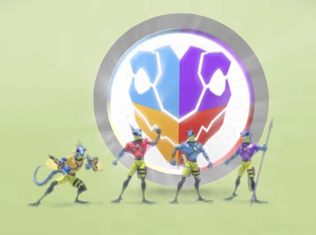Like Galileo, all of the lizards in the toyline are all small, blue, and muscular. They all wear a different color shirt, yellow pants with a gray belt, a black thigh bag on their left leg, and they have different color spines.